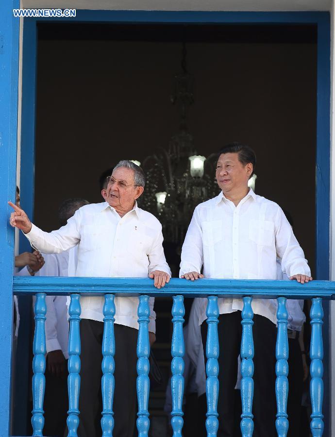 Chinese President Xi Jinping (R), with the accompany of Cuban leader Raul Castro, visits the municipal government of Santiago de Cuba, the Cuban "Heroic City," July 23, 2014. Xi visited Santiago de Cuba, the second largest city of Cuba, on Wednesday. (Xinhua/Lan Hongguang)