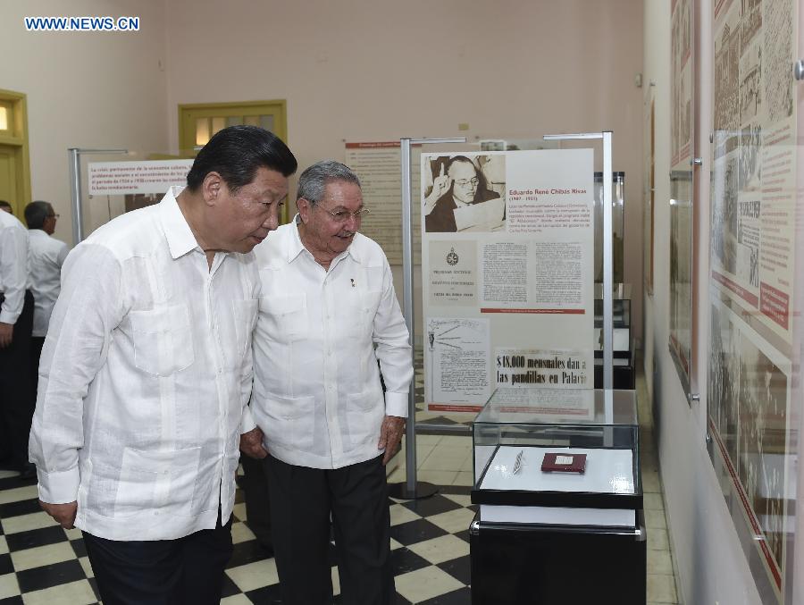 Chinese President Xi Jinping (L), with the accompany of Cuban leader Raul Castro, visits Moncada Barracks, where former Cuban leader Fidel Castro launched a failed assault on July 26, 1953, at Santiago de Cuba, the Cuban "Heroic City," July 23, 2014. Xi visited Santiago de Cuba, the second largest city of Cuba, on Wednesday. (Xinhua/Lan Hongguang)