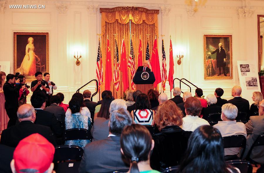 Former President of the Nixon Foundation Sandy Quinn speaks during the opening ceremony of the photo exhibition "Salute to Friendship - Images Narrate China-U.S. Collaboration During World War II" at the Nixon Library in Yorba Linda City of California, the United States, July 23, 2014. The photos were taken by soldiers of the U.S. Army Signal Corps in China during WWII. (Xinhua/Zhang Chaoqun)