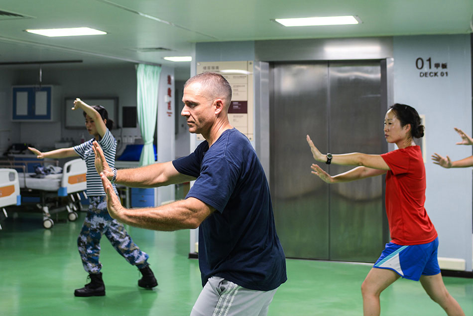 A medical officer from the US Military Sealift Command hospital ship USNS Mercy practices tai chi with Chinese medical officers on Chinese hospital ship Peace Ark on July 19, 2014. (Photo/Xinhua)