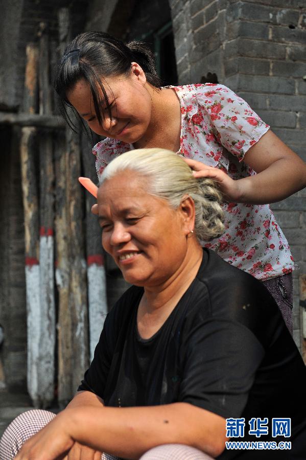 Niu Meili combs her mother's hair. (Xinhua/Lu Yan)