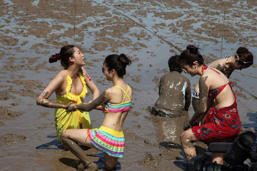 On July 22, 2014, thirty contestants to Miss Tourism China play in sea mud at the "Sea Mud Carnival" held in Xiushan, Zhoushan, Zhejiang province, attracting a largest number of tourists from Shanghai, Hangzhou, Suzhou and other cities. (Photo/youth.cn)