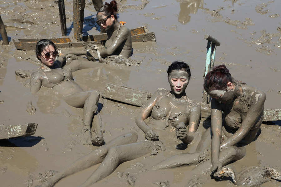 On July 22, 2014, thirty contestants to Miss Tourism China play in sea mud at the "Sea Mud Carnival" held in Xiushan, Zhoushan, Zhejiang province, attracting a largest number of tourists from Shanghai, Hangzhou, Suzhou and other cities. (Photo/youth.cn)