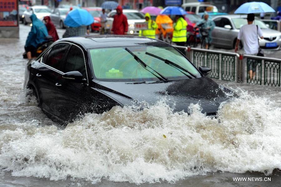 A car makes its way along a waterlogged road in Huai'an, east China's Jiangsu Province, July 25, 2014. Typhoon Matmo, the 10th typhoon that affects China this year, brought along heavy rainfalls to many places in Jiangsu. (Xinhua/He Jinghua)