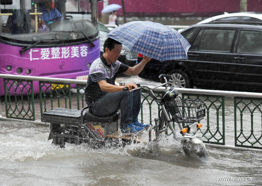 A man rides an electronic scooter along a waterlogged road in Huai'an, east China's Jiangsu Province, July 25, 2014. Typhoon Matmo, the 10th typhoon that affects China this year, brought along heavy rainfalls to many places in Jiangsu. (Xinhua/He Jinghua)