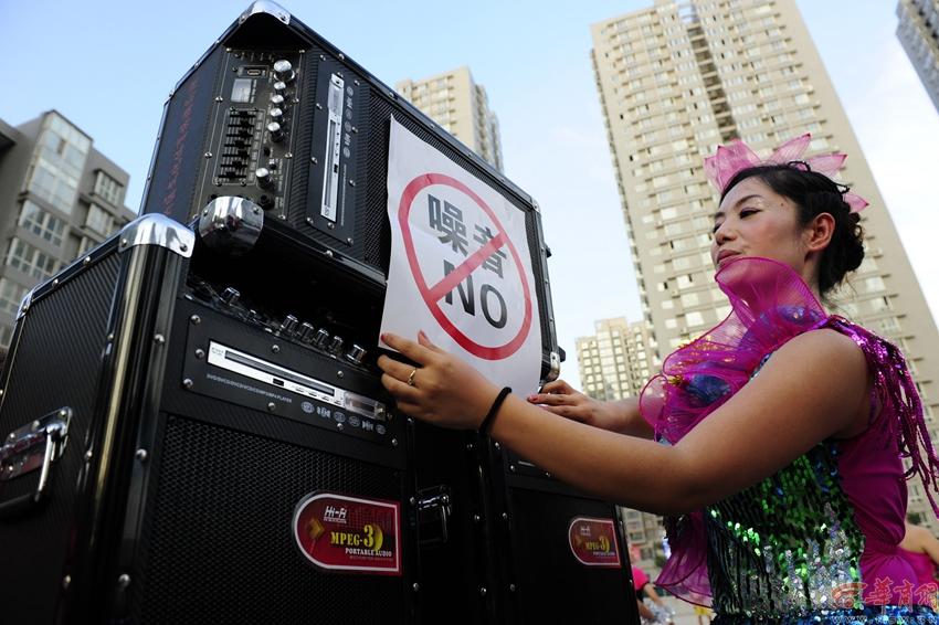 More than 1,000 Chinese damas attending Weiyang District square dancing final issuing proposal to control the timing and sound of square dance in Xi'an city on July 22, 2014. Holding placards reading "No Noise", they vowed to practice square dance from 7 a.m. to 9 p.m. only and to keep the sound down to 60 decibels. The square dance – a favorite of Chinese damas - can be seen everywhere in China. "Chinese dama", a group consisting mainly of married women between 40 and 60, grabbed the attention of the public for the first time in 2013. (Photo/HSW.CB)