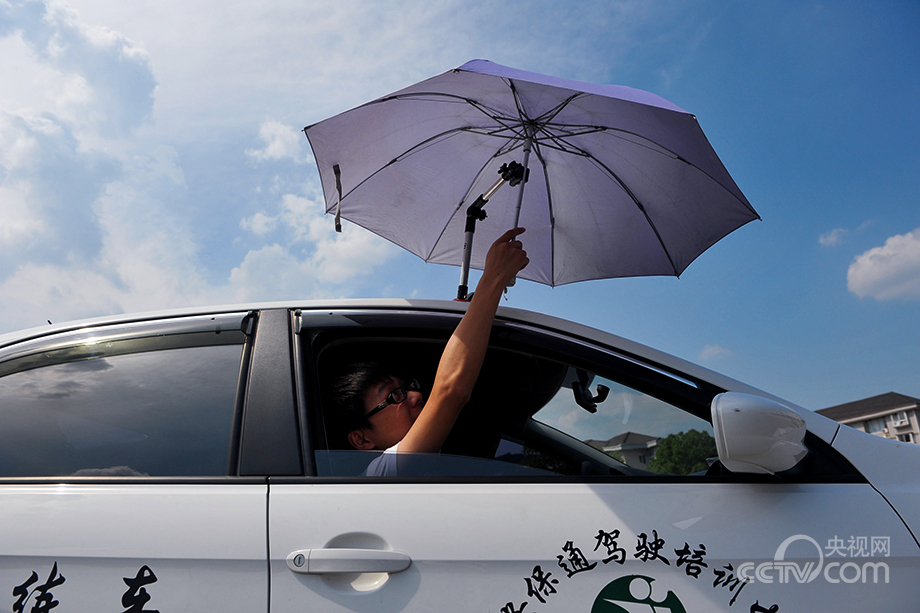 A car is equipped with a parasol on the roof in a driving school in Lin'an of east China's Zhejiang province on July 20, 2014. (Photo/CNTV)