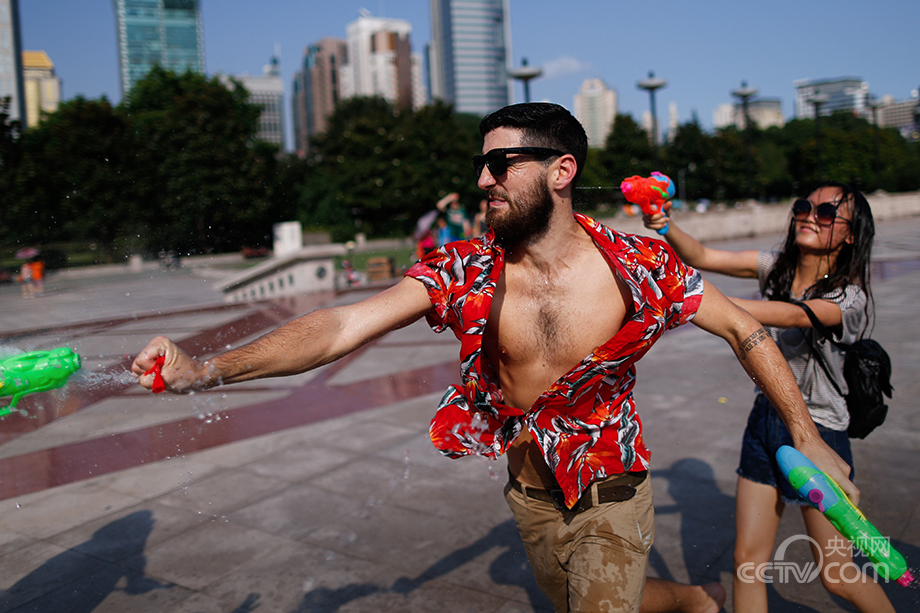 People holding colorful water gun play at the People's Square in Shanghai on July 20, 2014.(Photo/CNTV)