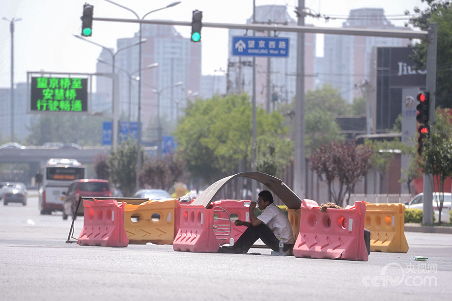 A man sits under a shade in Wangjing area of Beijing on June 9, 2014.(Photo/CNTV)