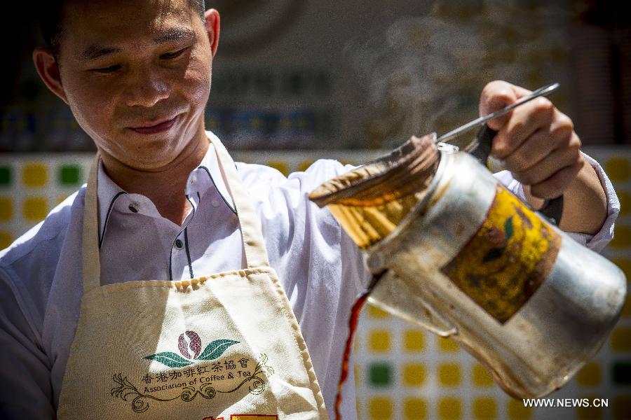 A milk tea chef makes Hong Kong style milk tea at Causeway Bay in south China's Hong Kong, July 28, 2014. To celebrate that Hong Kong style milk tea is on the list of Hong Kong's first intangible cultural heritage inventory which was announced by the Leisure and Cultural Services Department of Hong Kong on June 17, 2014, the Association of Coffee and Tea of Hong Kong invited milk tea chefs to display milk tea making skills at Causeway Bay Monday. (Xinhua/Lui Siu Wai)