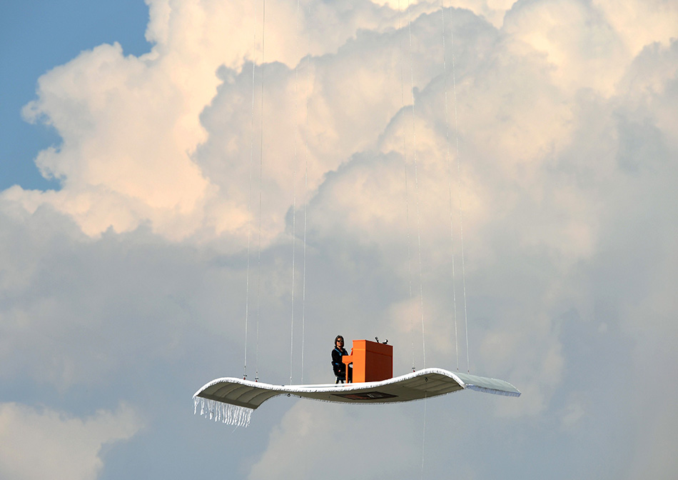German pianist Stefan Aaron hovers about the Munich airport Franz-Josef-Strauss, southern Germany on July 23, 2014. Stefan Aaron was seated in front of his piano on an aluminum structure that was reminiscent of a flying carpet and attached to a helicopter as part of his "Orange Piano Tour". (Source: Xinhua News Agency)