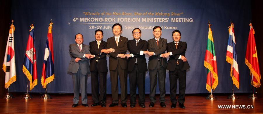 (L-R) Cambodia's Foreign Minister Hor Namhong, Laos's Foreign Minister Thongloun Sisoulith, South Korea's Foreign Minister Yun Byung-Se, Thailand's Foreign Minister Sihasak Phuangketkeow, Myanmar's Deputy Foreign Minister U Thant Kyaw and Vietnam's Foreign Minister Pham Binh Minh attend the 4th Mekong-ROK Foreign Ministers' Meeting in Seoul, South Korea, on July 29, 2014. (Xinhua/Park Jin-hee)