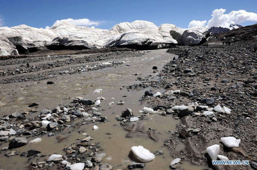 Photo taken on July 15, 2014 shows the melting ice of Purog Kangri Glacier in Shuanghu County, Nagqu, southwest China's Tibet Autonomous Region. As the highest terrain in the world's mid-latitude regions, China's Qinghai-Tibet Plateau is now under negative influence of the global warming. Purog Kangri Glacier, the third largest in the world, has shrunk by 50 meters over the past 30 years. (Xinhua/Tang Zhaoming)