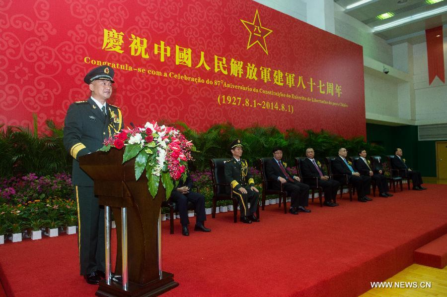 Commander of the Chinese People's Liberation Army (PLA) Garrison in the Macao Special Administrative Region (SAR) Wang Wen (1st L) addresses a reception to celebrate the 87th anniversary of the founding of the PLA, in Macao, south China, July 31, 2014. (Xinhua/Cheong Kam Ka)