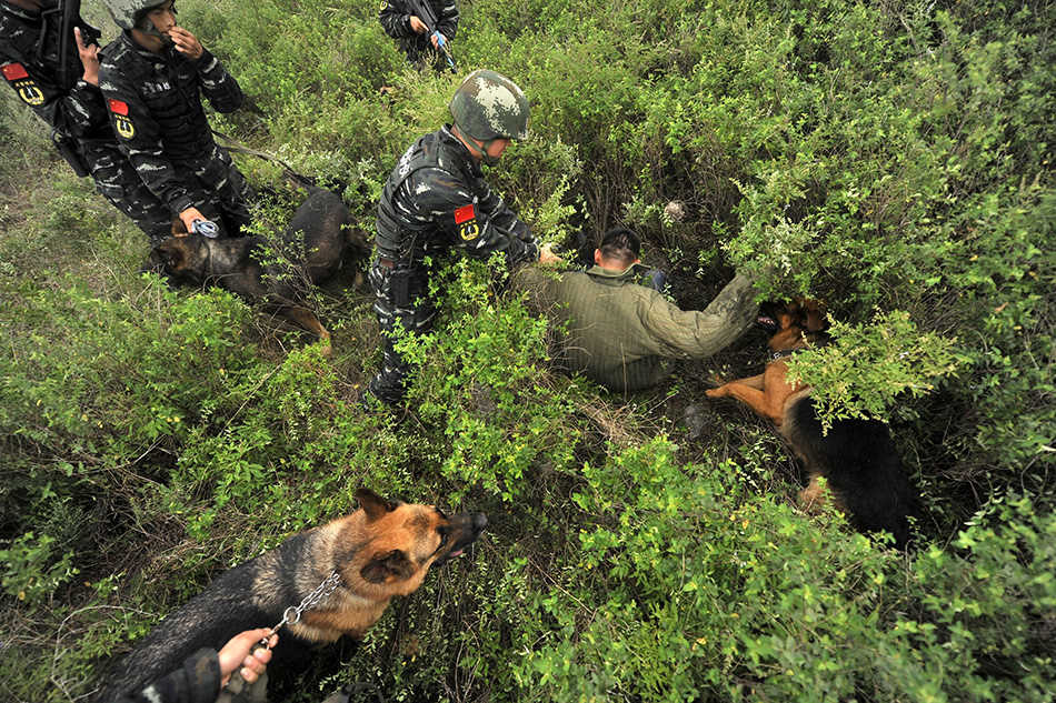 Armed police soldiers and police dogs take trainings on July 31, 2014. (Photo: Xinhua News Agency)