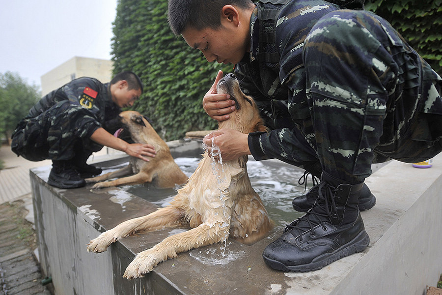 Armed police soldiers give a shower to police dogs after trainings on July 31, 2014. (Photo: Xinhua News Agency)
