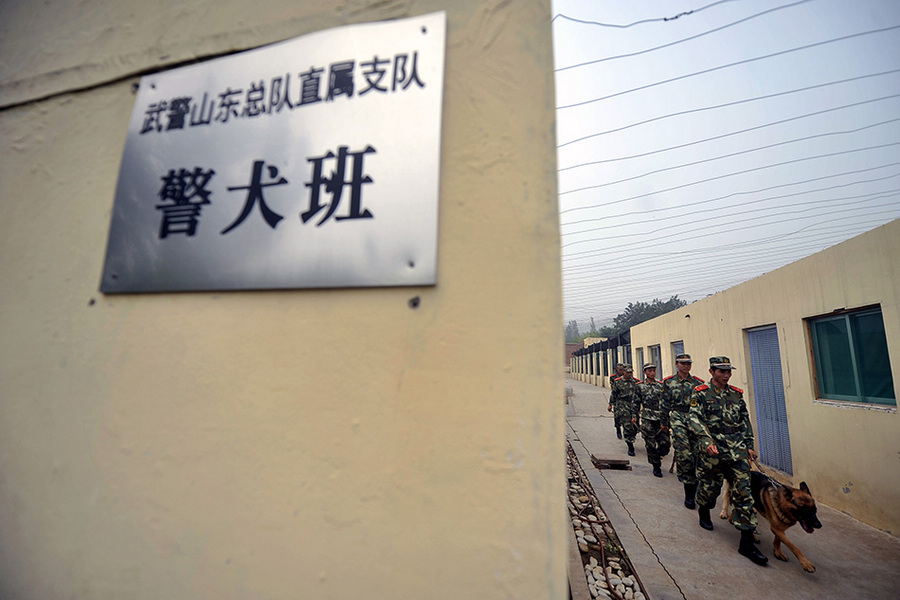 Armed police soldiers and police dogs take trainings on July 31, 2014. (Photo: Xinhua News Agency)