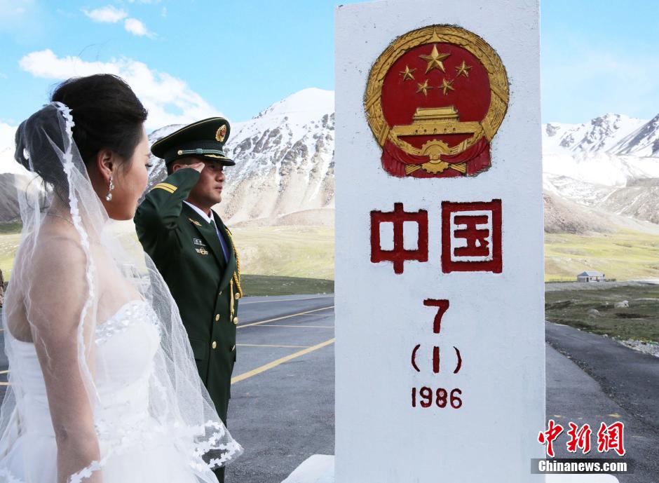 A collective wedding is held in front of the No. 7 pillar at the border between China and Pakistan in Taxkorgan, northwest China's Xinjiang on July 30, 2014. Fiver frontier soldiers and their brides swore their loves in front of the pillar on the plateau. (Photo/CNS)