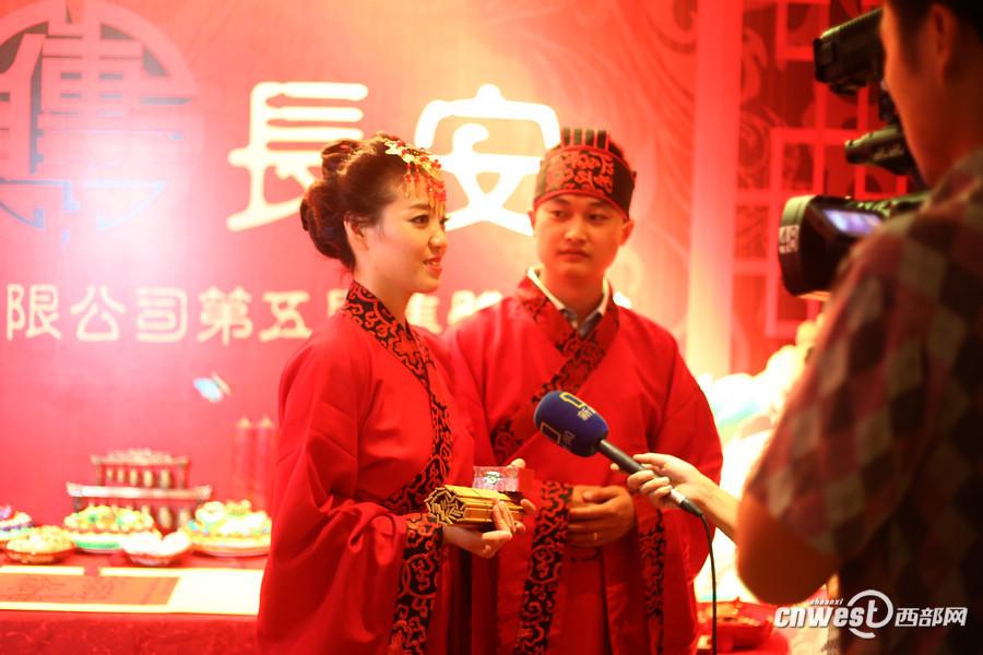 A total of 18 newlyweds attend a group wedding ceremony in Xi'an, capital of northwest China's Shaanxi province on Friday, as the "Qixi" festival approaches. They got married during the wedding wearing Han Chinese clothing, the costume of Han People in China, for the traditional service. "Qixi", marked on the seventh day of the seventh lunar month,is a traditional festival regarded as the Chinese Valentine's Day. (Cnwest Photo)