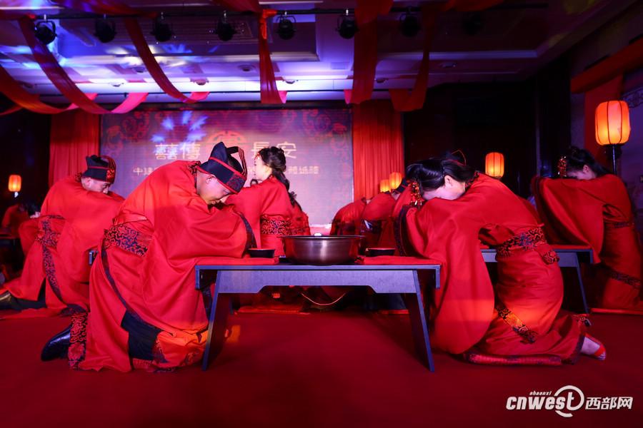 A total of 18 newlyweds attend a group wedding ceremony in Xi'an, capital of northwest China's Shaanxi province on Friday, as the "Qixi" festival approaches. They got married during the wedding wearing Han Chinese clothing, the costume of Han People in China, for the traditional service. "Qixi", marked on the seventh day of the seventh lunar month,is a traditional festival regarded as the Chinese Valentine's Day. (Cnwest Photo)