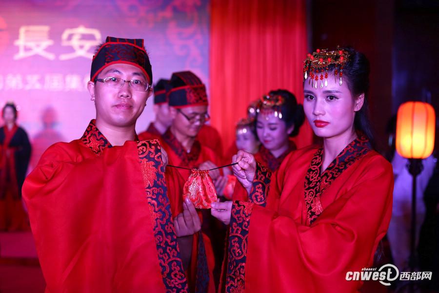 A total of 18 newlyweds attend a group wedding ceremony in Xi'an, capital of northwest China's Shaanxi province on Friday, as the "Qixi" festival approaches. They got married during the wedding wearing Han Chinese clothing, the costume of Han People in China, for the traditional service. "Qixi", marked on the seventh day of the seventh lunar month,is a traditional festival regarded as the Chinese Valentine's Day. (Cnwest Photo)