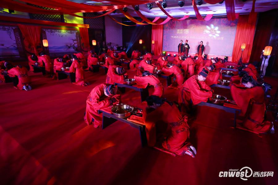 | A total of 18 newlyweds attend a group wedding ceremony in Xi'an, capital of northwest China's Shaanxi province on Friday, as the "Qixi" festival approaches. They got married during the wedding wearing Han Chinese clothing, the costume of Han People in China, for the traditional service. "Qixi", marked on the seventh day of the seventh lunar month,is a traditional festival regarded as the Chinese Valentine's Day. (Cnwest Photo) |