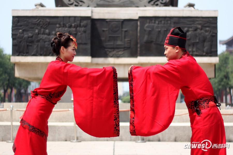 A total of 18 newlyweds attend a group wedding ceremony in Xi'an, capital of northwest China's Shaanxi province on Friday, as the "Qixi" festival approaches. They got married during the wedding wearing Han Chinese clothing, the costume of Han People in China, for the traditional service. "Qixi", marked on the seventh day of the seventh lunar month,is a traditional festival regarded as the Chinese Valentine's Day. (Cnwest Photo)