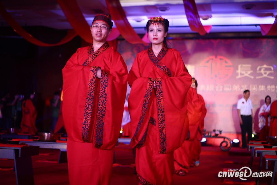 A total of 18 newlyweds attend a group wedding ceremony in Xi'an, capital of northwest China's Shaanxi province on Friday, as the "Qixi" festival approaches. They got married during the wedding wearing Han Chinese clothing, the costume of Han People in China, for the traditional service. "Qixi", marked on the seventh day of the seventh lunar month,is a traditional festival regarded as the Chinese Valentine's Day. (Cnwest Photo)