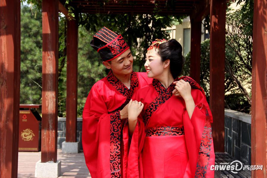 A total of 18 newlyweds attend a group wedding ceremony in Xi'an, capital of northwest China's Shaanxi province on Friday, as the "Qixi" festival approaches. They got married during the wedding wearing Han Chinese clothing, the costume of Han People in China, for the traditional service. "Qixi", marked on the seventh day of the seventh lunar month,is a traditional festival regarded as the Chinese Valentine's Day. (Cnwest Photo)