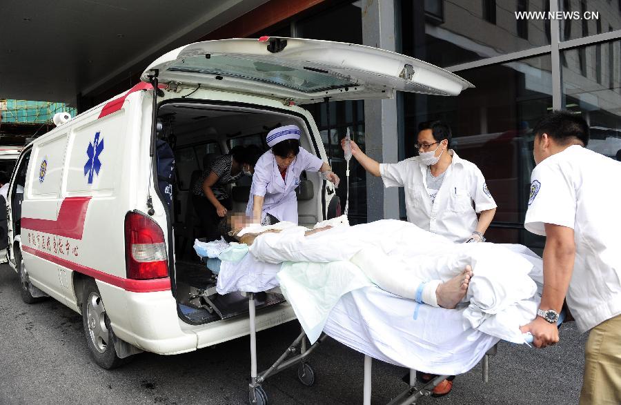 | An injured person of a blast accident in Kunshan arrives at the Third People's Hospital of Wuxi City, east China's Jiangsu province, Aug. 2, 2014. A powerful factory blast has killed 69 people and injured over 180 others in Kunshan on Saturday morning. The injured have been treated in hospitals in Kunshan and the nearby cities of Suzhou, Wuxi and Shanghai. (Xinhua) |