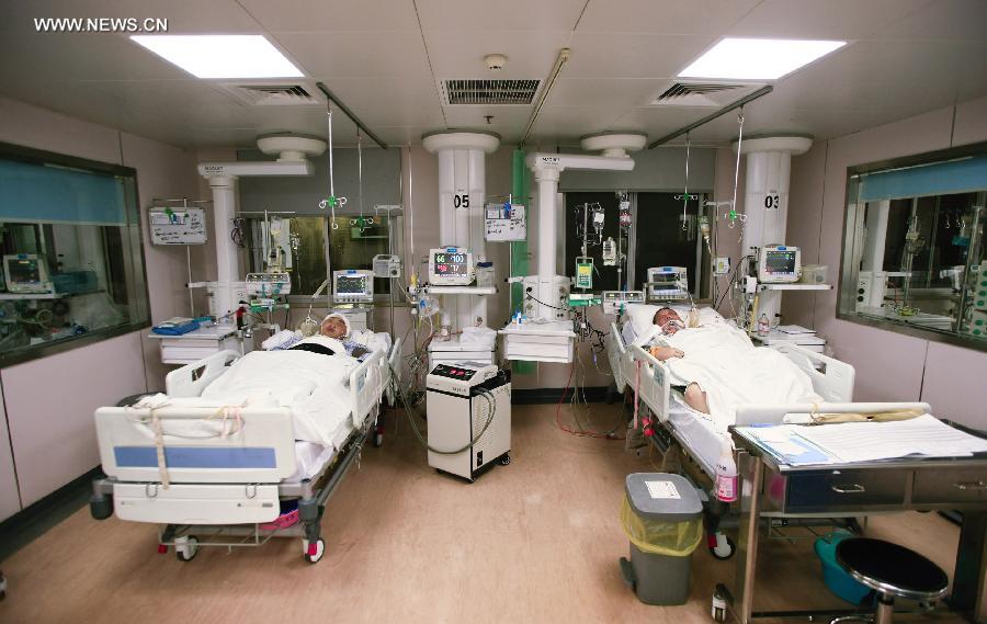 Seriously injured victims receive medical treatment in intensive care unit at the No. 1 Hospital Affiliated to Suzhou University in Suzhou, east China's Jiangsu Province, Aug. 2, 2014. An explosion has killed 69 people and injured more than 180 others after ripping through a factory in Kunshan City of Jiangsu Province on Saturday morning. (Xinhua/Chen Yichen)
