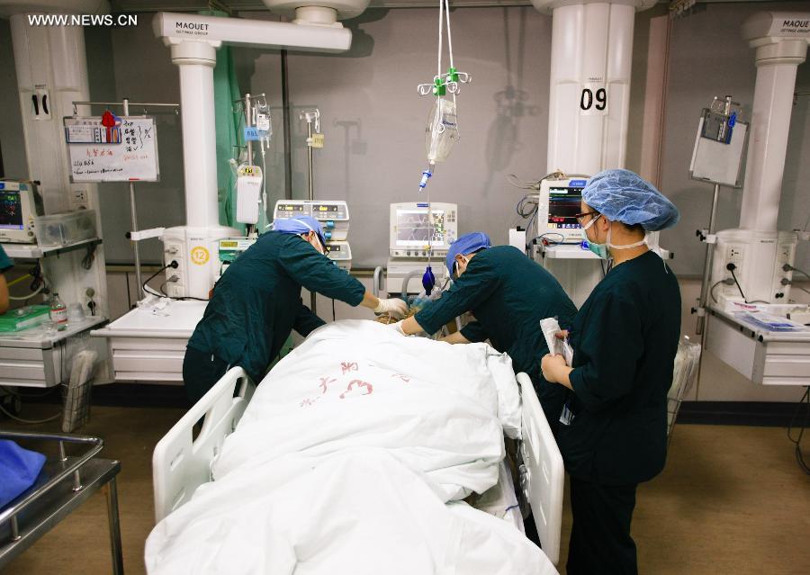 A seriously injured victim receives medical treatment in intensive care unit at the No. 1 Hospital Affiliated to Suzhou University in Suzhou, east China's Jiangsu Province, Aug. 2, 2014. An explosion has killed 69 people and injured more than 180 others after ripping through a factory in Kunshan City of Jiangsu Province on Saturday morning. (Xinhua/Chen Yichen)
