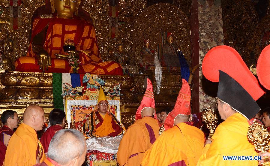 | The 11th Panchen Lama Bainqen Erdini Qoigyijabu (back) attends a religious ceremony at Sakya Monastery in Xigaze, southwest China's Tibet Autonomous Region, Aug. 2, 2014. A religious ceremony is held at Sakya Monastery, a prominent temple for Tibetan Buddhism's Sakya Sect, to celebrate the animal year of Panchen Lama Bainqen Erdini Qoigyijabu in the Chinese horoscope. There are 12 new year animals matching different lunar years in Chinese calendar, and every person takes on the animal sign of his or her birth year. (Xinhua/Chogo) |