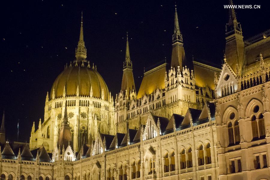 Photo taken on Aug. 2, 2014 shows the Hungarian Parliament illuminated by new decorative lights in Budapest, Hungary. (Xinhua/Attila Volgyi)