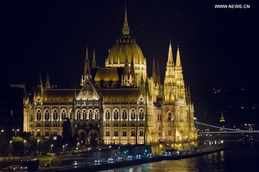 | Photo taken on Aug. 2, 2014 shows the Hungarian Parliament illuminated by new decorative lights in Budapest, Hungary. (Xinhua/Attila Volgyi) |