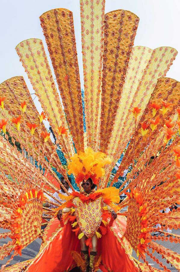 A Scotiabank Caribbean Carnival participant walks in the parade in Toronto, Aug. 2, 2014. Commonly called Caribana, the event culminated Saturday with its annual parade, with colorful costumes, upbeat music and dancing in the streets. (Xinhua/AP Photo)
