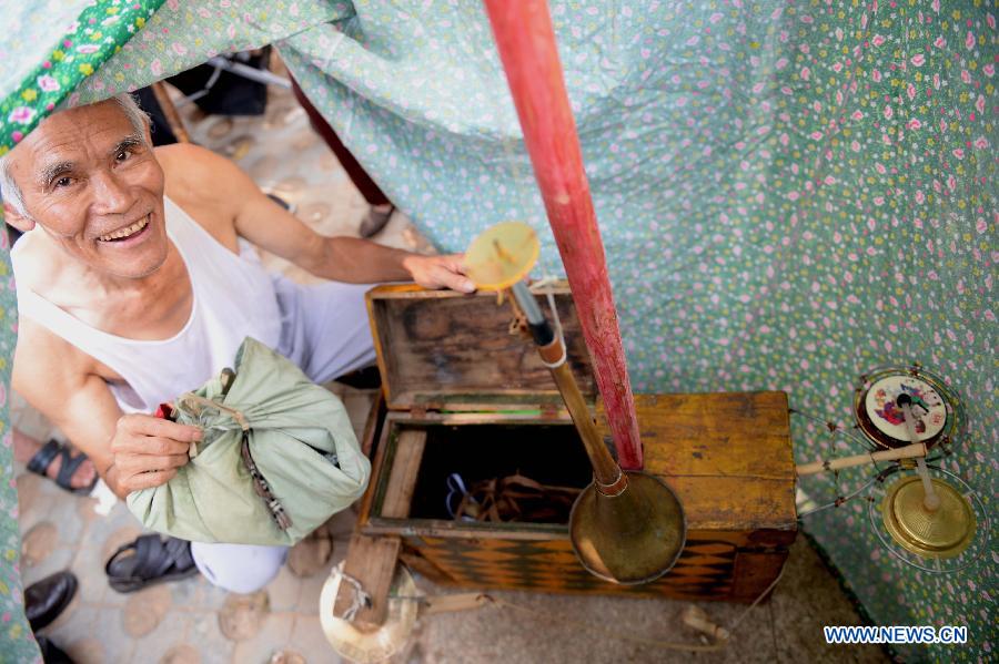 Puppeteer Xiao Qiulin displays the "magic box" for his puppet show performing in Yudu County, east China's Jiangxi Province, Aug. 1, 2014. Xiao, 65, started making a living by performing puppet shows for local residents since his twenties. With a stage enclosed by a piece of cloth, a set of instruments and several puppets, Xiao could perform a show for his audience all by himself. Now Xiao has recruited several apprentices, hoping that one day he could build a puppet troupe and his craftsmanship could be carried forward. (Xinhua/Chen Zixia)