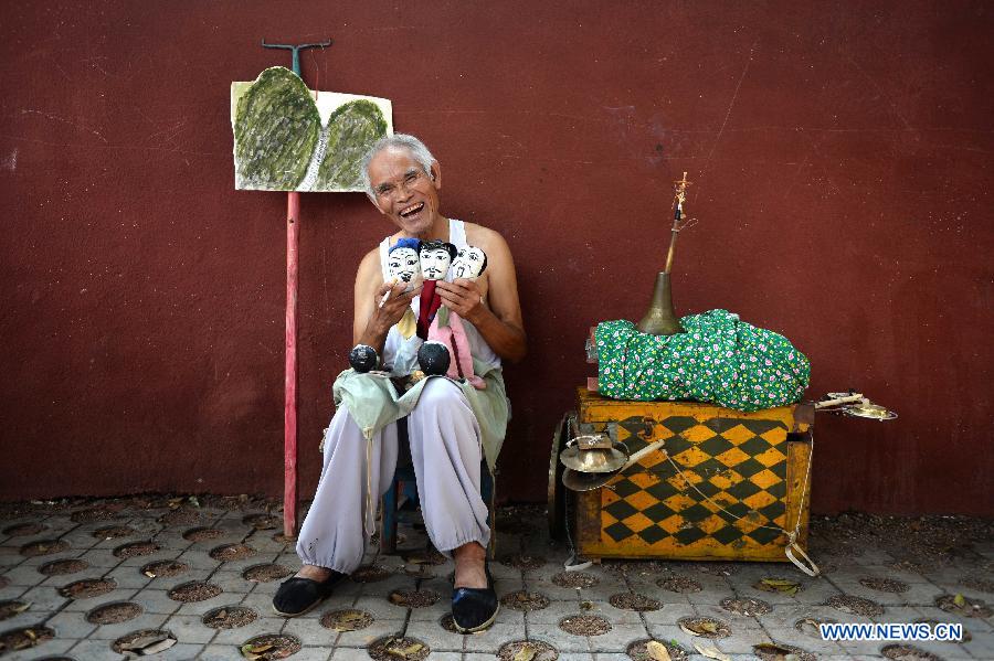 Photo taken on Aug. 1 , 2014 shows puppeteer Xiao Qiulin and his show equipments in Yudu County, east China's Jiangxi Province. Xiao, 65, started making a living by performing puppet shows for local residents since his twenties. With a stage enclosed by a piece of cloth, a set of instruments and several puppets, Xiao could perform a show for his audience all by himself. Now Xiao has recruited several apprentices, hoping that one day he could build a puppet troupe and his craftsmanship could be carried forward. (Xinhua/Chen Zixia)