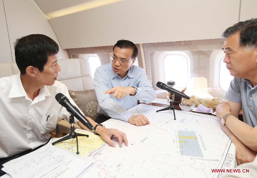 Chinese Premier Li Keqiang (C) gives instructions on disaster relief aboard a plane heading for the earthquake zone in southwest China's Yunnan Province, Aug. 4, 2014. (Xinhua/Yao Dawei)