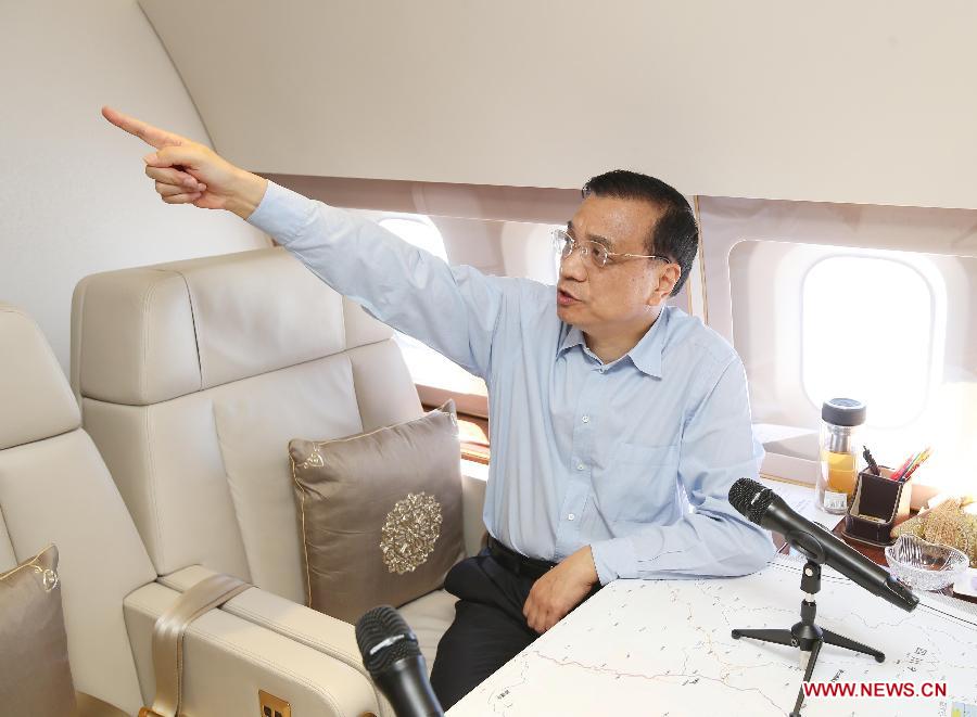 Chinese Premier Li Keqiang gives instructions on disaster relief aboard a plane heading for the earthquake zone in southwest China's Yunnan Province, Aug. 4, 2014. (Xinhua/Yao Dawei
