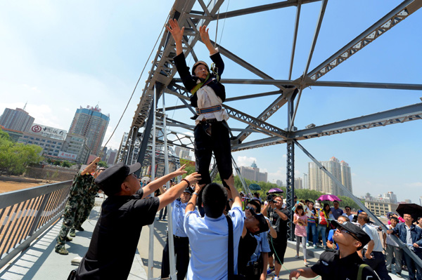 | A 76-year-old man is rescued by police and firefighters after he attempted to commit suicide on a bridge across the Yellow River in Lanzhou, Gansu province, on July 3. PEI QIANG/CHINA DAILY |