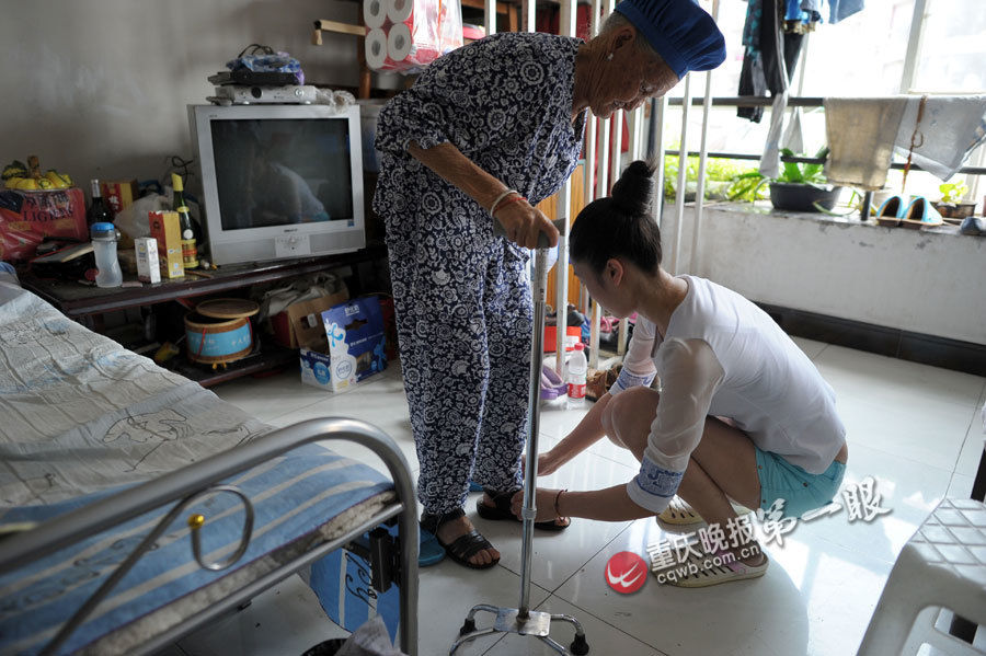 Huang helps her grandma put on shoes. (Photo/cqwb.com.cn)