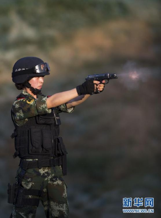 Li Changdan practices rapid fire with two type 92 postols on July 28, 2014. (Xinhua)