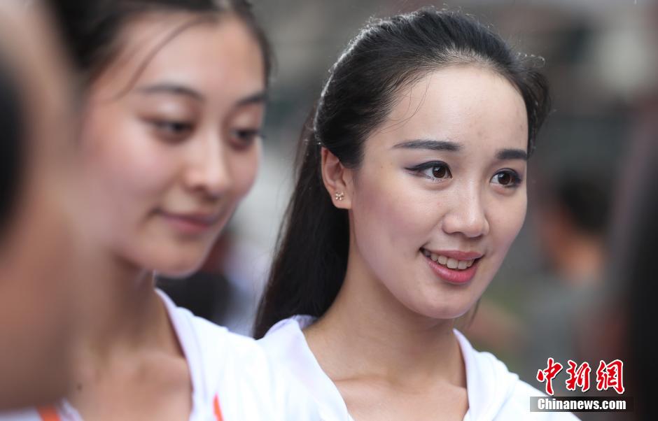 Braving the scorching heat, 205 guides selected from local universities and high schools devote themselves to the training for the opening and closing ceremonies of the 2nd Youth Olympic Games at the Olympic Sports Centre in Nanjing on August 1, 2014. (CNS/Yang Bo)