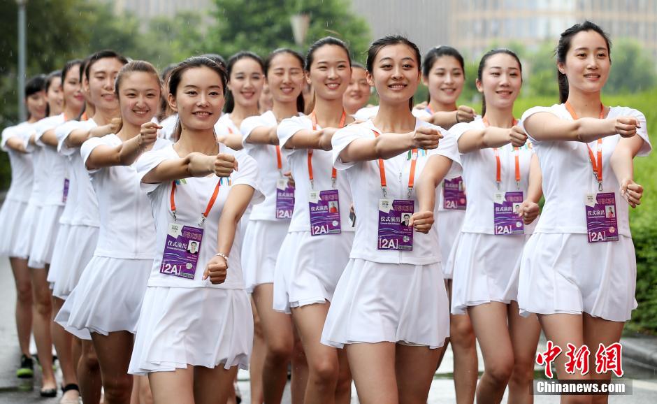 Braving the scorching heat, 205 guides selected from local universities and high schools devote themselves to the training for the opening and closing ceremonies of the 2nd Youth Olympic Games at the Olympic Sports Centre in Nanjing on August 1, 2014. (CNS/Yang Bo)
