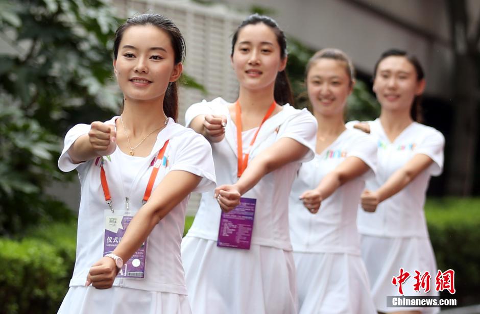 Braving the scorching heat, 205 guides selected from local universities and high schools devote themselves to the training for the opening and closing ceremonies of the 2nd Youth Olympic Games at the Olympic Sports Centre in Nanjing on August 1, 2014. (CNS/Yang Bo)