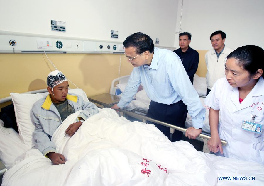 Chinese Premier Li Keqiang (2nd L), also a member of the Standing Committee of the Communist Party of China (CPC) Central Committee, calls upon a patient who was injured in a 6.5-magnitude earthquake during a visit to the People's Hospital in Ludian County of Zhaotong, southwest China's Yunnan Province, Aug. 5, 2014. Li also extended his gratitude to the medical staff while visiting the hospital. (Xinhua/Yao Dawei)