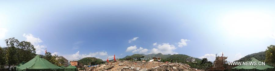 Panoramic photo taken on Aug. 5, 2014 shows quake-hit Longtoushan Town of Ludian County, southwest China's Yunnan Province, Aug. 5, 2014. At least 398 people have been killed after a 6.5-magnitude earthquake rattled the province Sunday afternoon. The epicenter of the strong quake is in Longtoushan Town. (Xinhua/Xing Guangli)