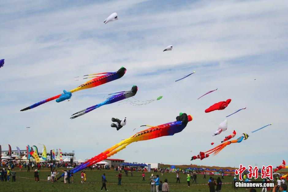 The 2014 China Hohhot Grassland Kite Cultural Festival is held in Xilamuren Grassland of the Inner Mongolia Autonomous Region in which 35 teams from China and abroad have participated. The sky of the grasslands is adorned by dozens of kites. (Chinanews.com/Wu Yana)