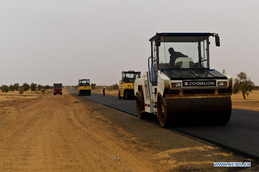 Photo taken on Aug. 4, 2014 shows the road construction site built by China in the Brakna Region, southern Mauritania. The 172km road which connects regions of Aleg, Kiffa, Assaba and Brakna, all located in Western Sahara, belongs to one of the China's assistance constructions in the northwest African country. (Xinhua/Li Jing)